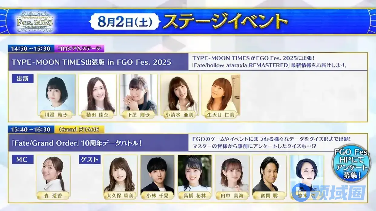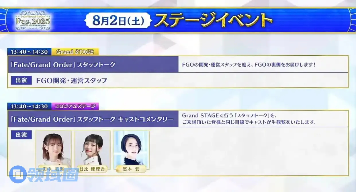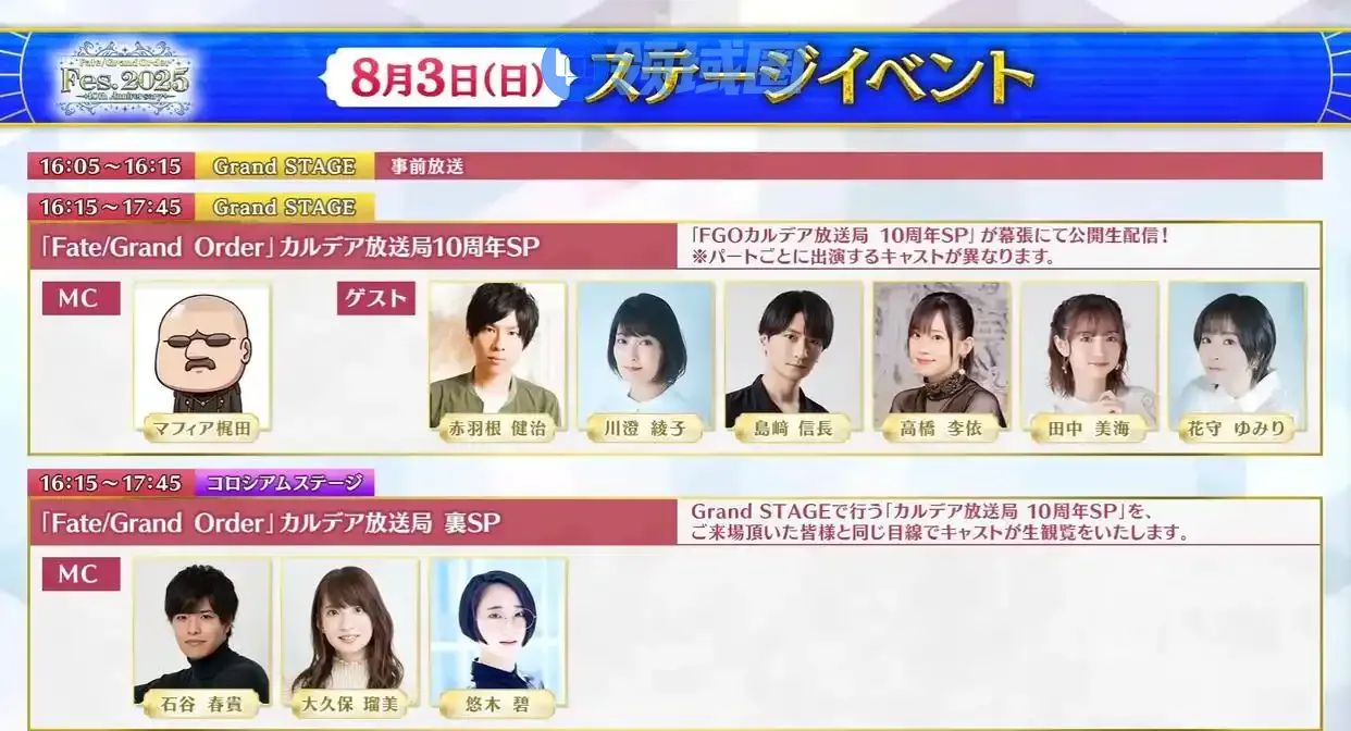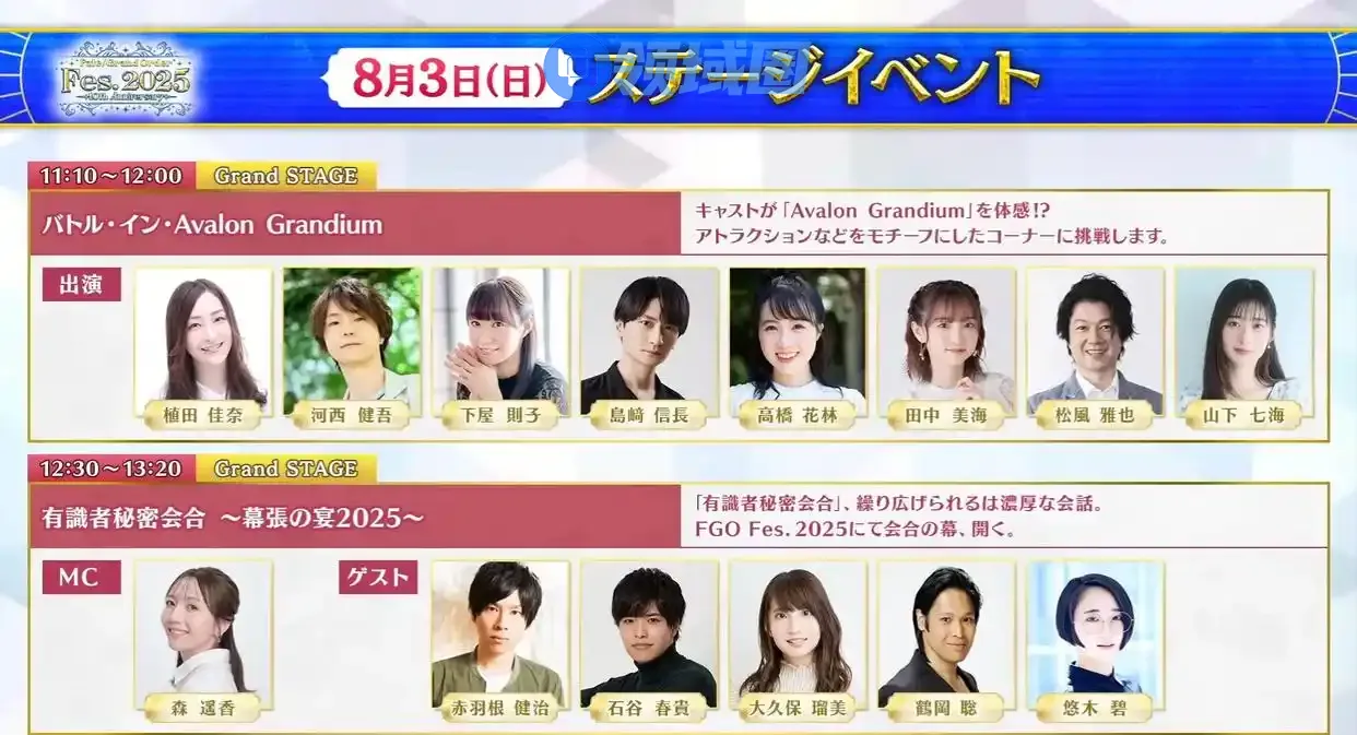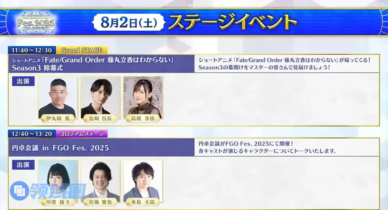 第二个节目时间为11:40~12:20,节目标题为“圆桌会议in FGO Fes.2025”,邀请嘉宾川澄绫子、松风雅也、水岛大宙,就是吹水节目。