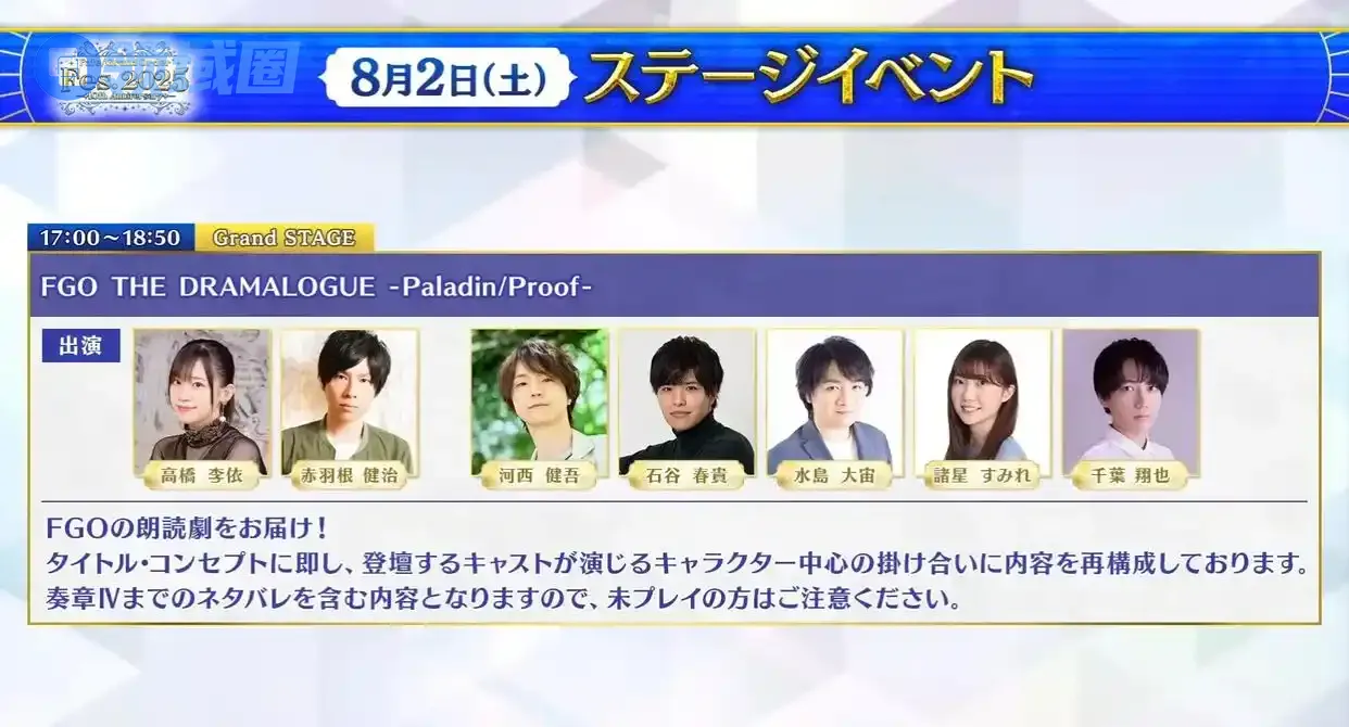 16:00~17:50是FGO奏章4的朗读剧,出演嘉宾高桥李依、赤羽根健治、河西健吾、石谷春贵、水岛大宙、诸星堇、千叶翔也。