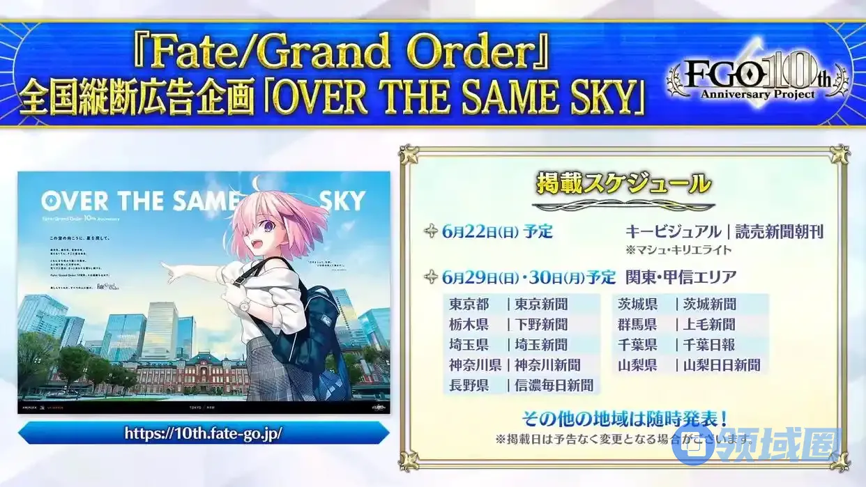 最后就是跟五周年一样的报纸广告企划,到时候会在各地的报纸上刊登FGO从者的插画,6月22日刊登的是玛修。其他地区和从者立绘后续会发布。