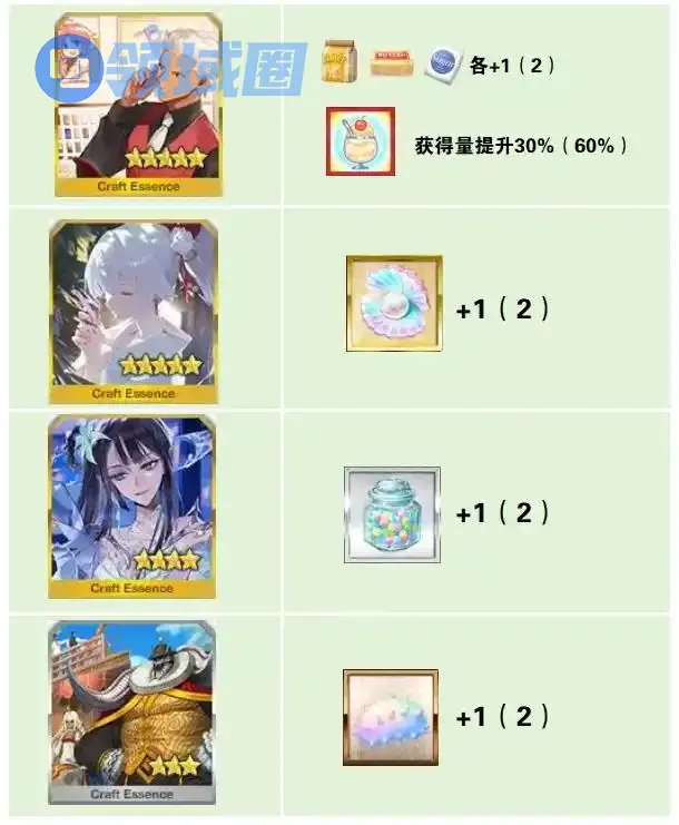 以上是本次活动的礼装加成情况,活动赠送礼装是增加制作材料的掉落,以及提升点数的获得量,可以平铺使用。