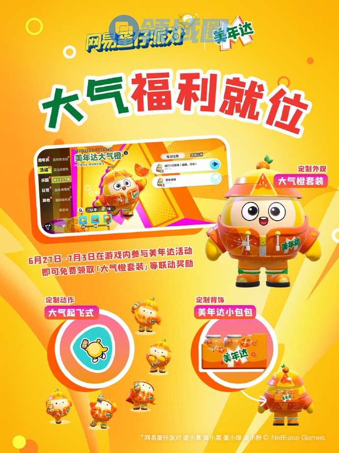 蛋仔派对将要开启和美年达的联动活动,在这次活动期间,大家还可以获取大气橙套装,下面为大家带来联动活动的具体内容,感兴趣的玩家们千万不要错过哦!