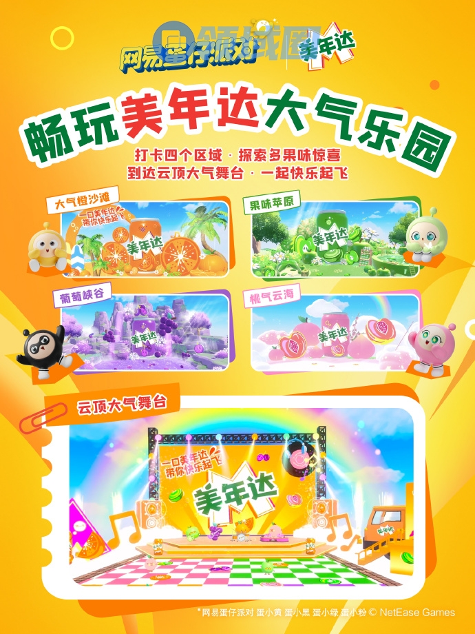 6.27起,在《蛋仔派对》乐园搜索地图“美年达大气乐园”,进入美年达缤纷果味世界。