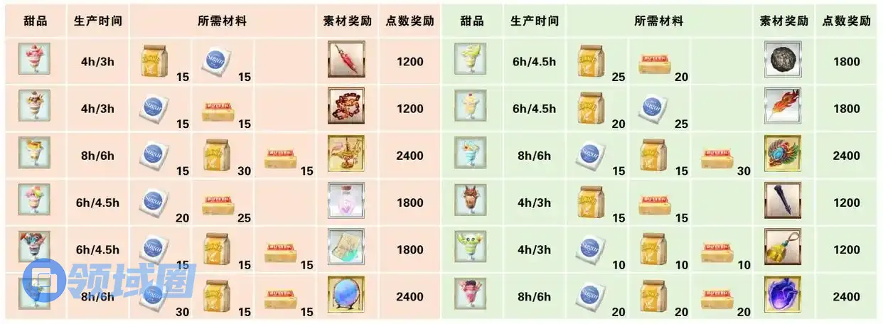 可制作的甜品一共是12种,随主线开启而增加种类,并且能同时制作的种类也会提升,这里的表格总结了所有甜品的制作时间、所需材料和可获得的奖励。