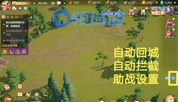 龙石战争,队伍可以开启“自动回城”,“自动拦截”,“助战设置”。