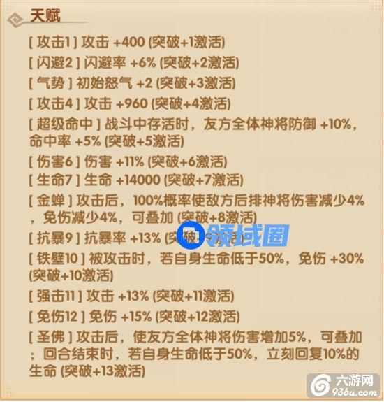 天赋上看,关键突破等级8和13提供的是强力增伤的效果,并且是普攻触发,攻击光环令对方望而生畏~