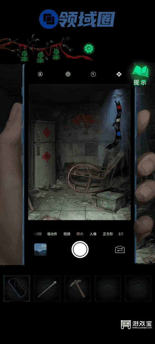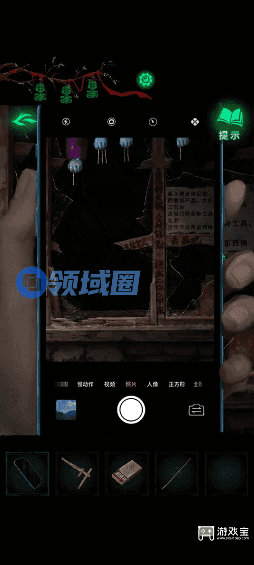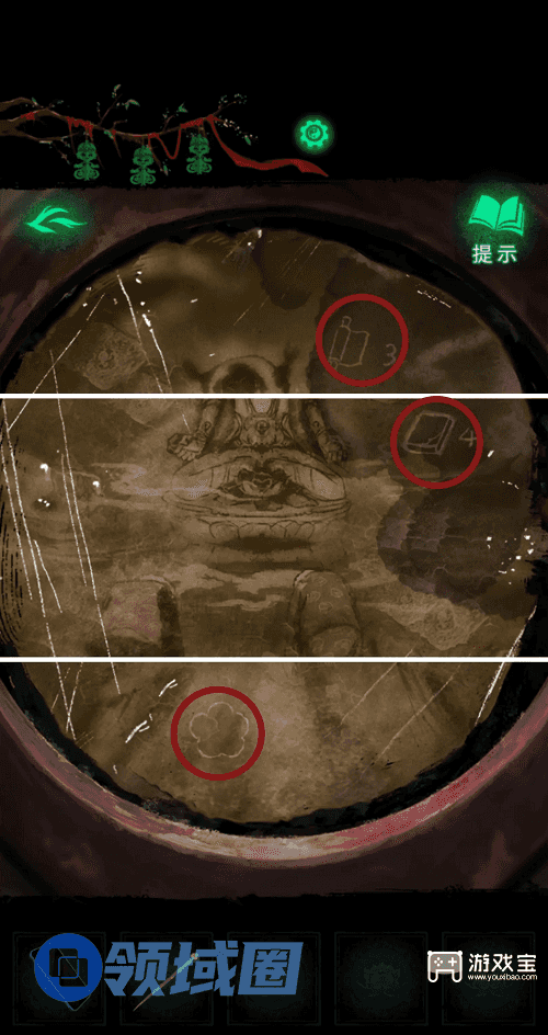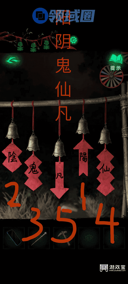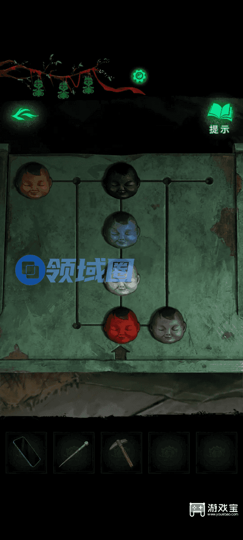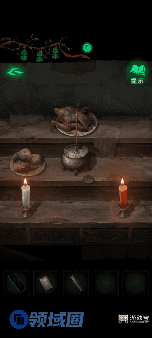 9、退出场景回到村口,触发剧情,剧情结束后将祈福风铃放在左侧风铃架上获得门锁线索,回到村内场景进入2楼点击门锁,输入得到的线索后解锁新场景,进屋后使用手机获得线索,点击右侧下方绿箱子,进入小游戏(注意下方箭头,排列方式是从下到上的),小游戏结束后。左侧有个账本点开后获得村口屋子祭坛排列方式,右侧获得朱砂。