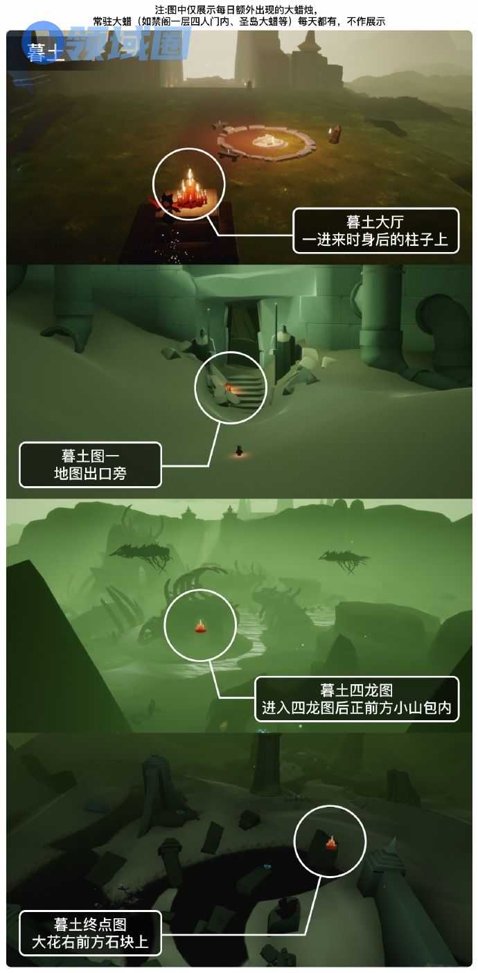 光遇今天的大蜡烛刷新在了暮土这张地图,那么大家知道7.8每堆大蜡烛的具体位置在哪里吗?下面为大家带来光遇7月8日大蜡烛位置的具体内容,感兴趣的玩家们千万不要错过哦!