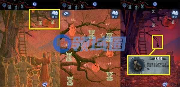 4、注意树枝的形状,根据聂莫黎视角获得的线索,娃娃的位置与线索位置是镜像,面具位置与线索位置是一致的。正确答案请参考下图