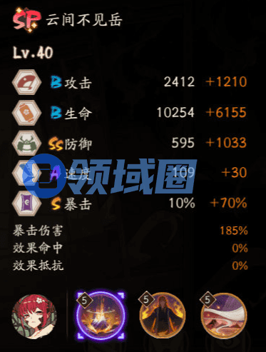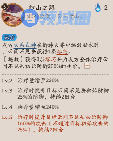 Lv.5.治疗时提升目标云间不见岳初始防御160%的攻击(不超过目标初始攻击的25%),持续2回合