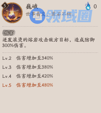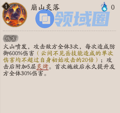 火山喷发,攻击敌方全体3次,每次造成防御600%伤害(云间不见岳技能造成的单次伤害均不超过自身初始攻击的20倍);攻击后附加5层炙烤。首次施放后永久提升友方全体30%伤害。