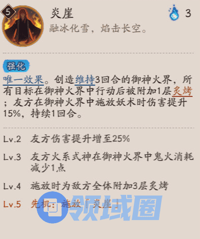 唯一效果。创造维持3回合的御神火界,所有目标在御神火界中行动后被附加1层炙烤;友方在御神火界中施放妖术时伤害提升15%,持续1回合。