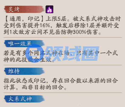 【通用,印记】上限5层。被火系式神攻击时受到伤害提升16%,触发后移除1层并額外受到1次敌方云间不见岳防御300%伤害。