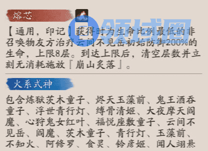 友方火系式神在御神火界中施放妖术时,云间不见岳获得1层熔芯。