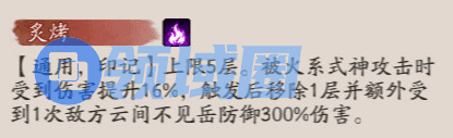 【通用,印记】上限5层。被火系式神攻击时受到伤害提升16%,触发后移除1层并额外受到1次敌方云间不见岳防御300%伤害。