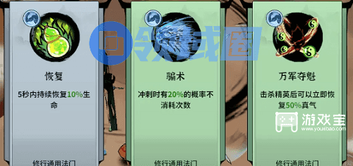 除了神通技能之外,每一场战斗还会出现通用技能,通用技能会为我们提供额外辅助的能力与恢复功能等作用,有的技能效果还能堆叠。通用技能也是升级后才会出现,它会与神通技能交替穿插着出现,同样是3选1,与神通技能不同的是,局内技能更需要针对当前局势的状况进行选择,且存在一定的随机性,所以它不是固定化思路。