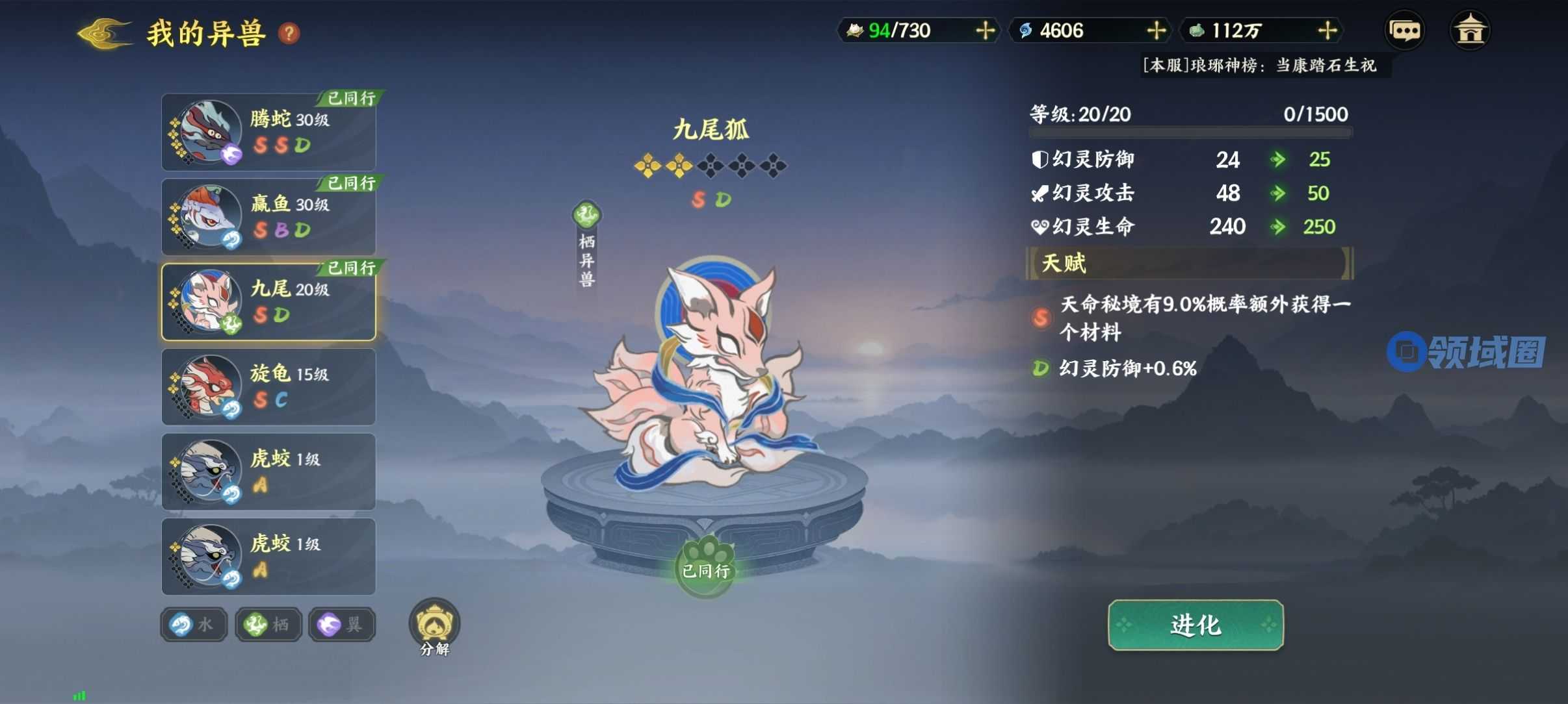 再举一个例子比如下方图里的二星S天赋九尾狐(本体)进化成三星,最多可以继承2个天赋,那么我们可以进化的时候,喂一只带有S天赋的狗粮异兽,这样我们就可以选择两个S天赋来继承,从而得到一个双S天赋的九尾狐(本体)。