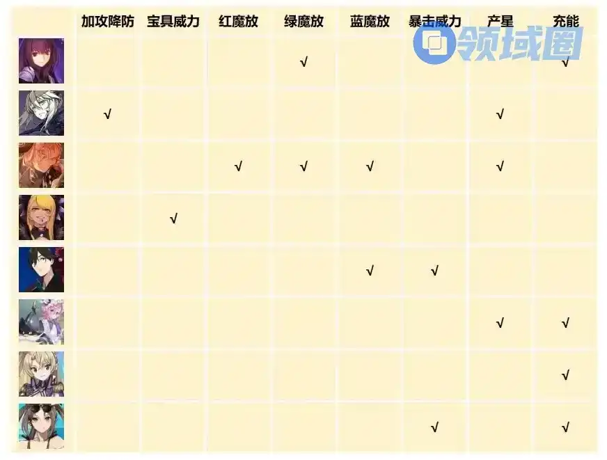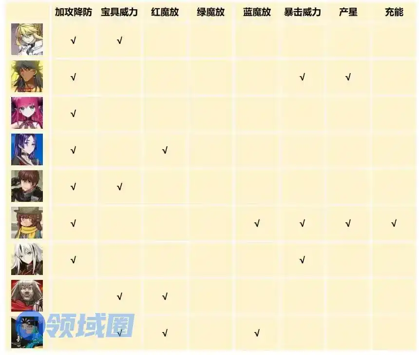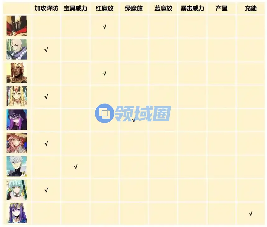 剩下的基本都是一个加攻或宝威,搭配一个魔放,就比较看主输出的适性,阿育王有2种魔放提供,也算是比较广泛的。