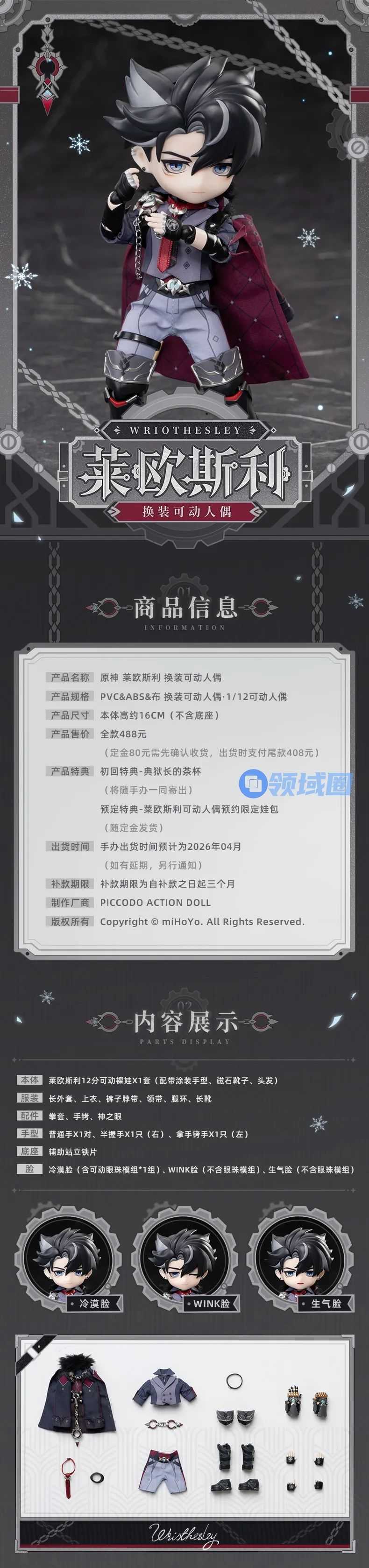 产品分可动人偶本体与服装及配件,配备了「拳套」、「手铐」、「神之眼」装饰配件,及多款替换手型、替换表情配件,可供旅行者为莱欧斯利设计多种造型。目前该新品已开放预览,欢迎旅行者前往店内查看详情~