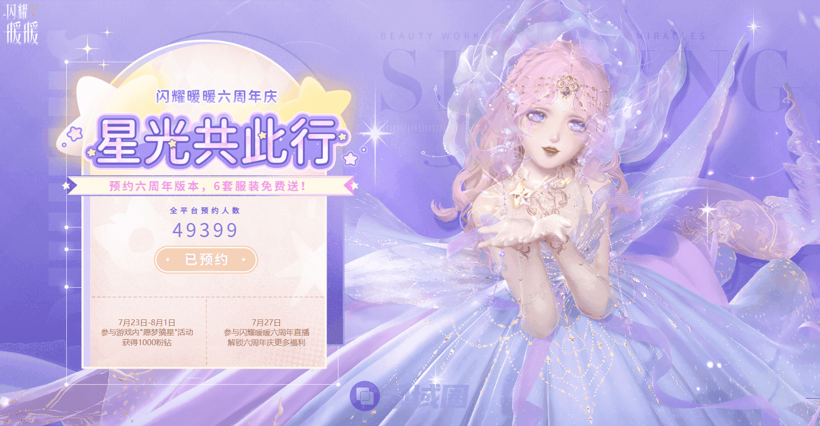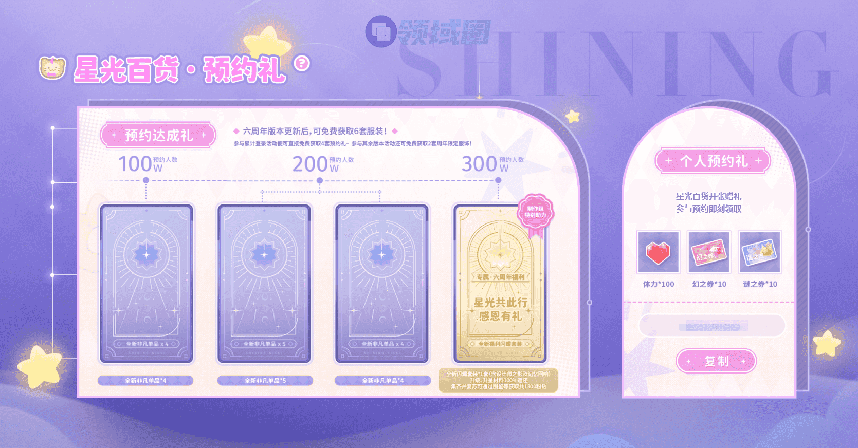 全平台预约达成300万人,解锁专属六周年重磅福利,星光共此行感恩礼【全新闪耀套装*1套(含设计师之影及记忆回响)!升级、升星材料100%返还,集齐并复苏可通过图鉴等共获取1300粉钻】