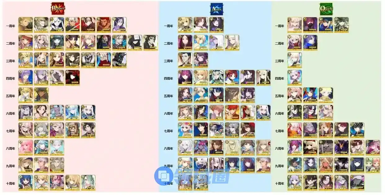 这里简单模拟了一下,大概想上面这样,可以分成30个卡池,一些从者较多的部分,或许也可以拆分成2个卡池,例如前三年的红卡,4/6/8/9周年的蓝卡,以及8/9周年的绿卡,一些成员较少的也可能合并,例如2~4周年的绿卡。