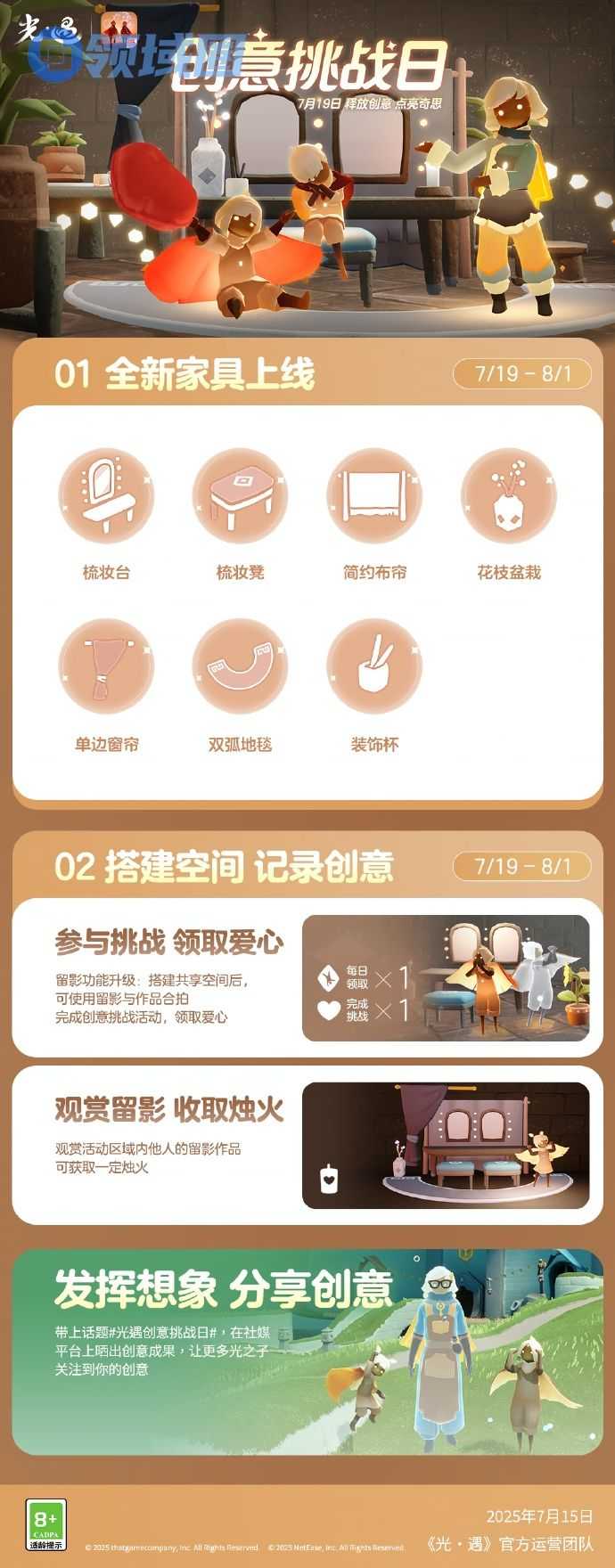 以上就是关于光遇创意挑战日怎么玩的全部内容了,希望能为各位玩家们带来帮助,想要了解更多游戏攻略及资讯请持续关注领域圈游戏。