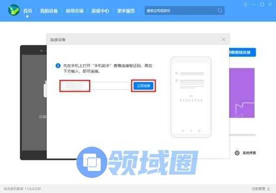 在手机端打开手机助手查看连接验证码,然后在电脑端输入验证码,并点击“立即连接”。