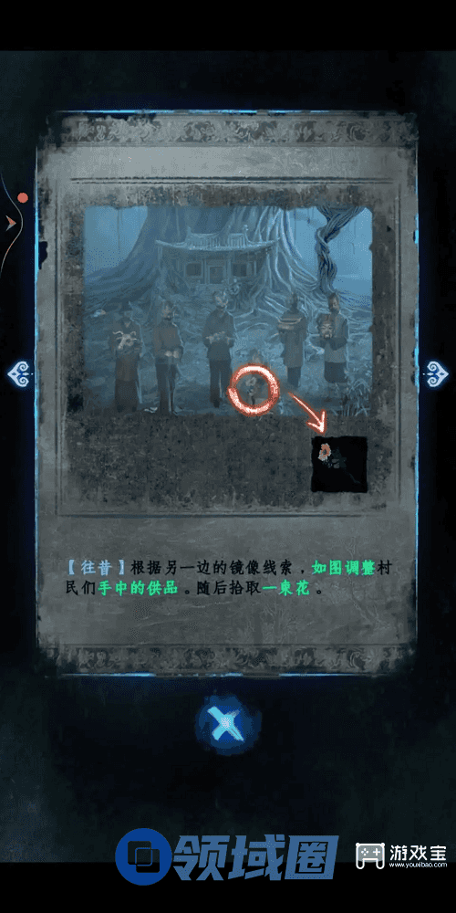 2.调整贡品:在“往昔”场景,根据镜像线索,调整村民手中的供品,之后拾取一束花。