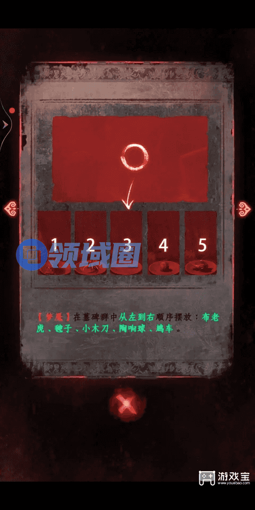 8.摆放物品:在“梦魇”场景的墓碑群中,从左到右依次摆放布老虎、毽子、小木刀、陶响球、鸠三。
