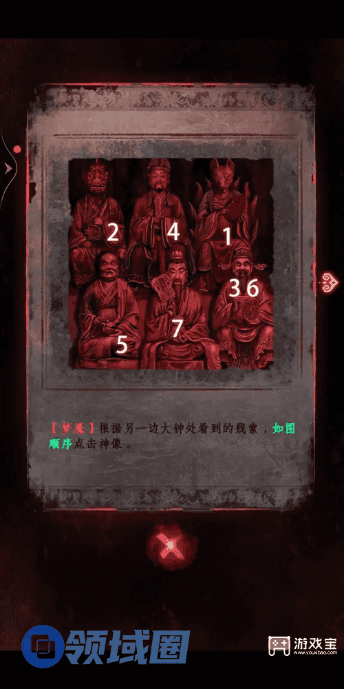 10.点击神像:在“梦魇”场景,根据“往昔”大钟处的线索,按顺序点击神像。