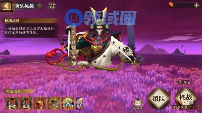 ※「演武挑战」:活动期间,大人可消耗100体力挑战「演武荒骷髅」,每日可获得5次挑战次数,最多可存储15次。大人还可选择组队协力迎战,所有队伍成员均可获得和单人挑战成功时相同的基础奖励,并且还将根据组队人数额外获得五星青吉鬼。