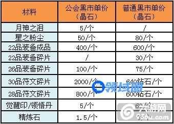常见材料公会黑市与普通黑市价格对比(公会黑市按最低价格计算)