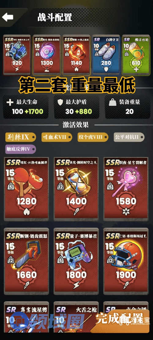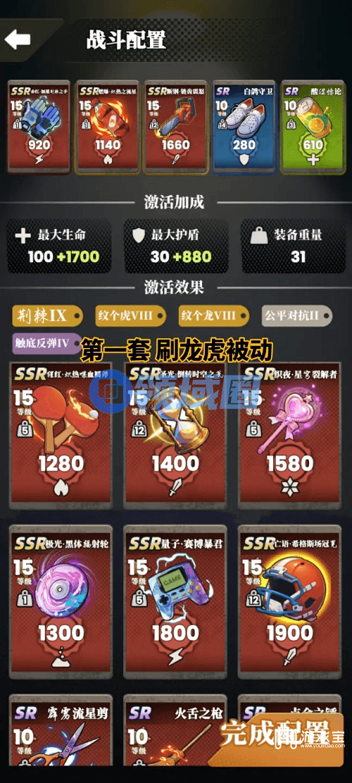 数据说明:①攻击力:就不说了②护盾和生命:刷怪时有盾先扣盾无盾扣血。③装备重量:影响攻击速度,重量越大速度越慢,有的怪速度很快,那攻击的时候就是对方先手。所以重量尽量选低的可以抢先手。④激活效果:点开可以看到详细介绍 龙虎前期必带,盾血刷够了的话,目前SSR卡比较少,激活效果也不多,就随便带吧。