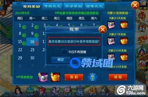 2、玩家可花元宝补签本月内漏签的日期并领取奖励,补一天花费20元宝。