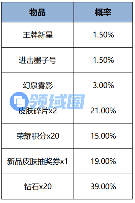 购买红蓝对决(1日),可额外获赠一个礼包,打开后可随机获得以下之一:王牌新星、进击墨子号、幻泉雾影、皮肤碎片x2、荣耀积分x20、新品皮肤抽奖券x1、钻石x20。累计100次必得进击墨子号和王牌新星。