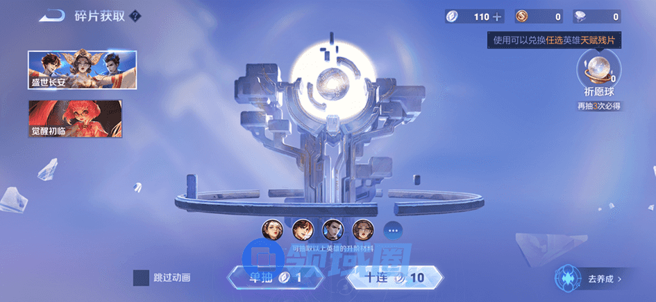 抽卡祈愿球:抽卡概率获得祈愿球,使用后可触发心愿十连,可指定1名英雄获取其天赋碎片