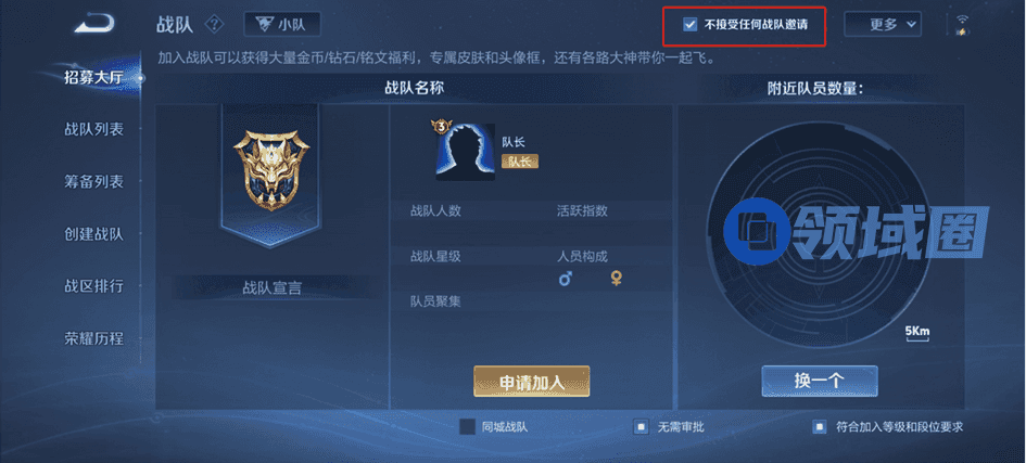 战队功能增加【不接受任何战队邀请】的设置,玩家勾选后将不会再收到任何战队的邀请;