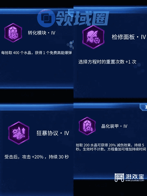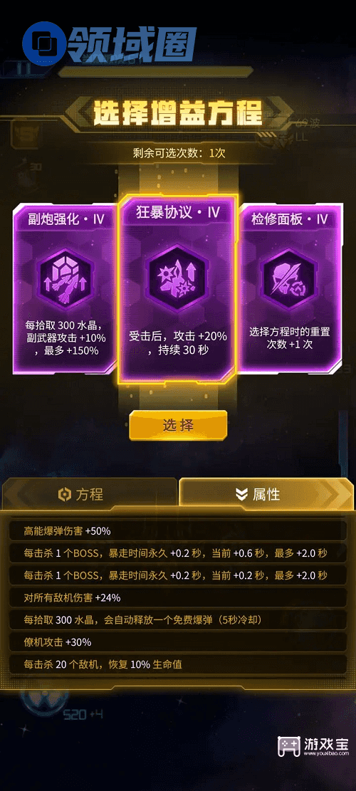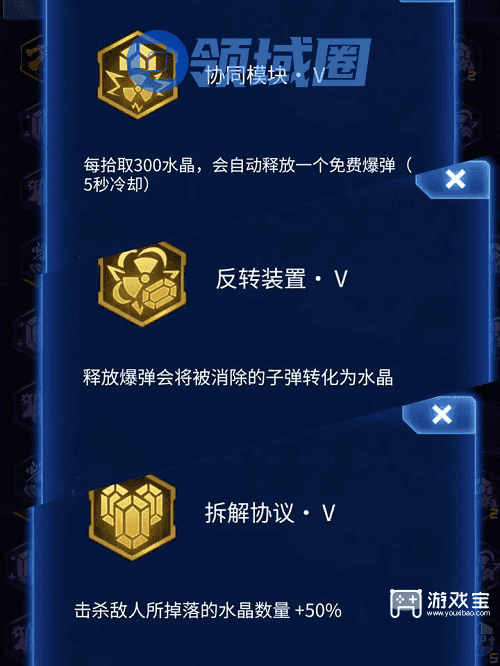 3、玩法:拿到狂暴协议,开始撞敌机子弹进行叠层,永世决意的被动,60%血量受击,不会一击必杀,所以,受击之后,击杀敌机,吃水晶进行回血,血量补足60%则再次受击,基本上40层就可以无痛过100波炼狱魔神,如果受击过程中不慎死亡,直接退掉游戏删除后台,重新进入,可以回到复活之前继续玩,前期尽量多拿回血与免伤,40%以上的回血,就足够叠层,免伤最高可叠76%,70以上的免伤,有比较大的概率可以受击四五次不掉血,对比回血受击,叠层会快很多,同时面对难打的boss,有更高的容错率,遇到boss在30秒内无法击杀时,必要可以死了复活,继续叠层,确保叠层不断,同时转换协议很重要,转换协议可以把敌方的弹幕变成水晶,当血量不足时,使用爆弹转水晶,可以补充血量,方便继续叠层,拆解协议提供的+50%水晶,可以让你更快升级,与回血,基本等于增加50%经验值,前期如果拿到,可以提供更多等级,可以选更多方程,其次就是新手战力低的,前期可以拿一些增伤方程,比如boss增伤,全体增伤,战机僚机副武器增伤,但主要还是以回血与免伤为主,其次就是爆弹CD,基本叠够300层左右,就可以通过333波,拿走全部奖励