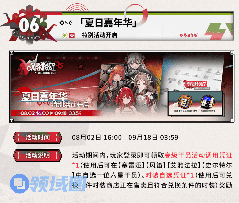 以上就是明日方舟2025夏日嘉年华限时活动汇总的全部内容了,希望玩家可以顺利的知道有哪些活动,更多精彩内容请关注领域圈游戏。