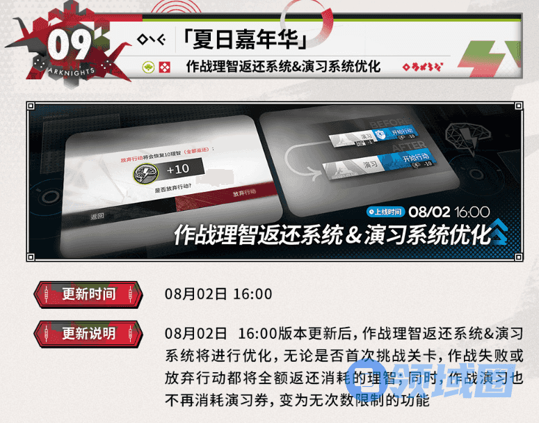「夏日嘉年华」,作战理智返还系统&演习系统优化,不再消耗演习券,同时失败或者退出全部返还理智。