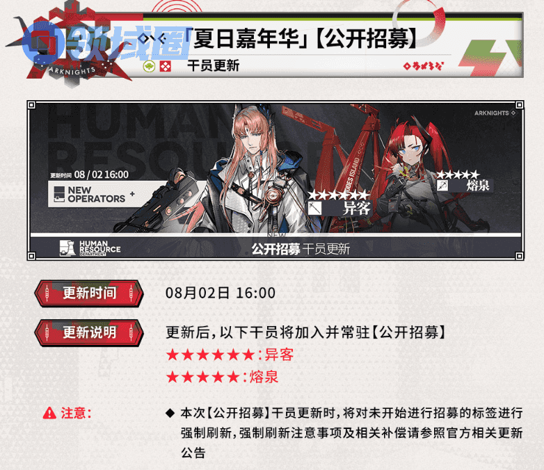 「夏日嘉年华」,【公开招募】干员更新,这次常驻的是异客和熔拳。