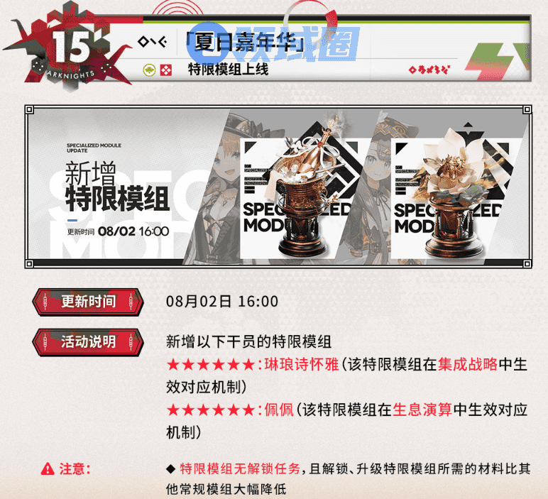 「夏日嘉年华」,特别活动开启,时间:8.2~8.16,六星干员自选,包括风笛、塞雷娅、42姐和小绵羊,同时还有一张皮肤自选券。