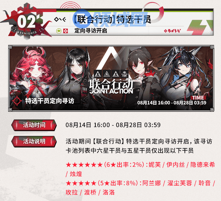 【联合行动】特选干员定向寻访开启,时间:8.14~8.28,,时间:8.14~8.28