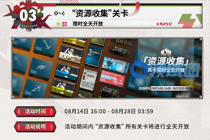 “资源收集”关卡限时全天开放,时间:8.14~8.28