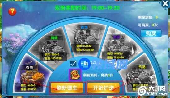 每日19:00-19:30开启双倍运镖,完成时可获得双倍的奖励,点击刷新镖车可以刷新镖车的品质,品质越好,奖励越好。点击护送开始护送。