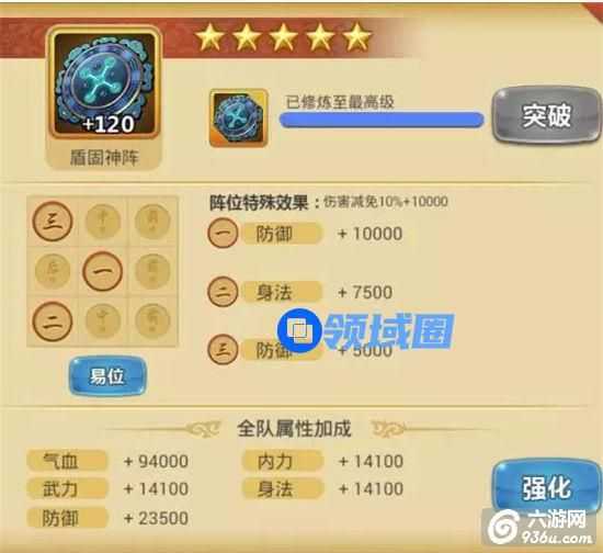 最后一个就是“盾固神阵”,光看属性就不难看出,它是一个防御阵法,单单看气血加成就比其他两个阵法多出20000多。满星之后提供的也是全伤害减免,你说耐打不耐打。