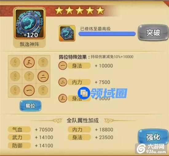 这是“飘逸神阵”,主要是重身法偏辅助的阵法。该阵法除了加成大量身法之外,还提供额外的持续伤害减免的阵位特殊效果。加成数值是百分比和固定10000之和。