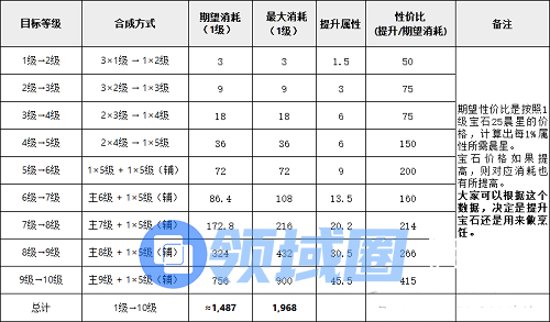 根据此规则,不难算出,每级宝石强化所需的消耗以及性价比: