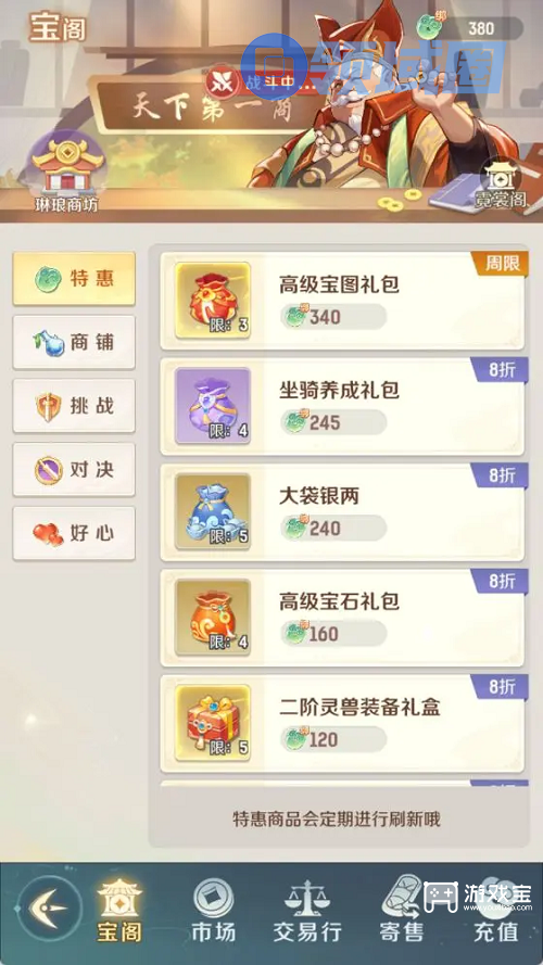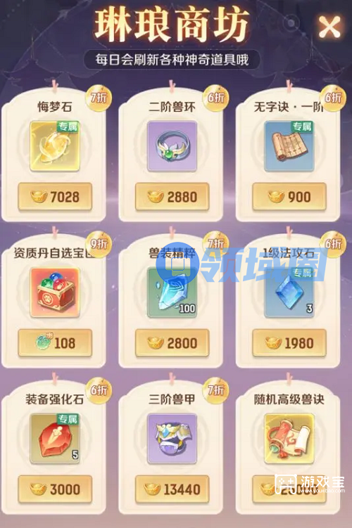 玲琅商坊每天早上5点都会刷新,目前可以确定的是每天必刷资质丹自选宝匣跟随机高级兽决。