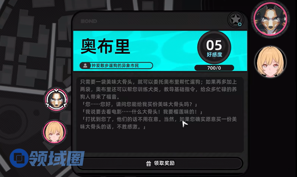 任务的流程相对简单,游戏会自动引导你完成所有任务。完成后,打开菜单中的【羁遇】界面,你就能看到奥布里这只三头犬的羁绊。点击进入后,你会看到一个奖励栏,其中标注着五级羁绊将奖励【三重奏观光线】道具。