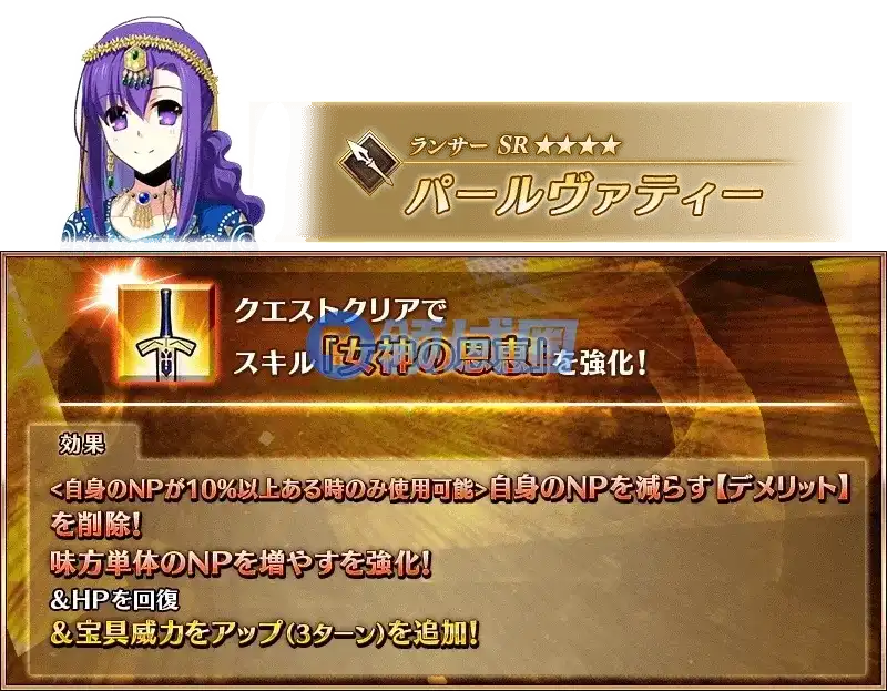 帕尔瓦蒂本次强化的是3技能,技能需要10%NP和扣NP的副作用取消,单体充能改为20%~30%,追加提升己方单体10%~20%宝具威力3回合效果。